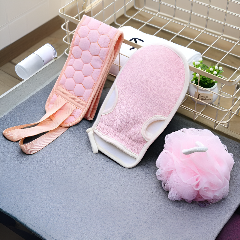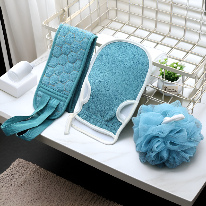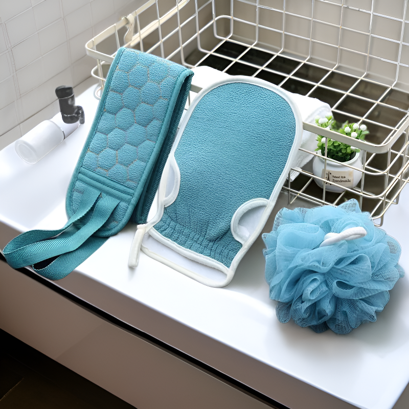 ● ชุดผ้าขนหนูสามชิ้นคุณภาพสูง มาพร้อมใยขัดตัวฟองน้ำและถุงมืออาบน้ำ ช่วยทำความสะอาดผิวได้อย่างหมดจดและอ่อนโยน